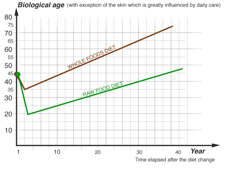 Therefore, the 80%, the whole foods regime would be equal in results to the raw food diet at some point, since the “whole food” people who are still getting younger will catch up to 100% raw individuals. (Remember those started to age again after just 3 years.)