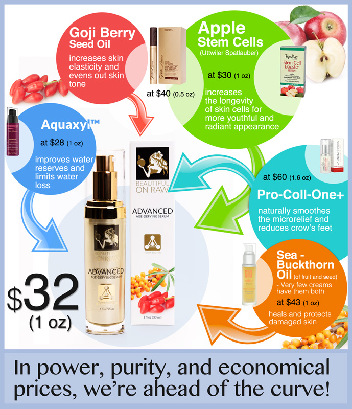 Beautiful on Raw's Advanced Age-Defying Serum is a super green wrinkle-control formula that helps transform your skin's appearance. This fast-acting firming serum is made from a unique combination of patented peptides and botanicals. It works to stimulate the production of collagen, restore skin's moisture balance, smooth facial skin and ward off wrinkles.