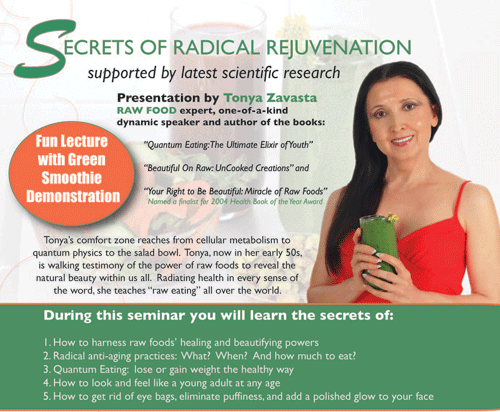 Hello Tonya & Nick, I was honored to be able to listen to you speak regarding the Raw Food information. You have a fabulous presentation. The best I have heard to date. Thank you for spending all of your time and efforts to get the correct information. In other words, you have done your homework and in my perception you deserve an A+++++. I have listed to several Raw Food speakers and have not been that impressed. You live the talk! You are the perfect example of what perfect health can be achieved. I just personally want to thank you from the deepest part of my heart. Because I have been researching Raw Food the past year, educating myself and doing more raw and will implement this even more into my diet, until I can change to 100% raw. Thank you! You have walked into my life at the perfect time. Now I can continue my journey and become healthy once again.