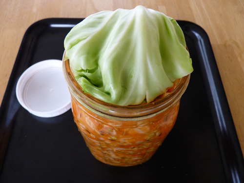 Roll one or two cabbage leaves and snuggly place them on top of the jar in order to keep the mixture submerged and to make sure no air gets in.