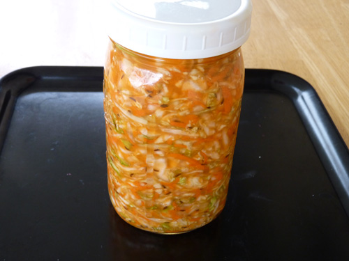 Put the lid on, cover it with a towel and leave it on the kitchen counter for a few days. If you wish, you can open it daily, burrow to the bottom of the jar with the handle of a wooden spoon and encourage the gas to escape, but this is an optional step. The brine might overflow a little, but this is normal and can be countered by standing the jar in a plate or bowl.