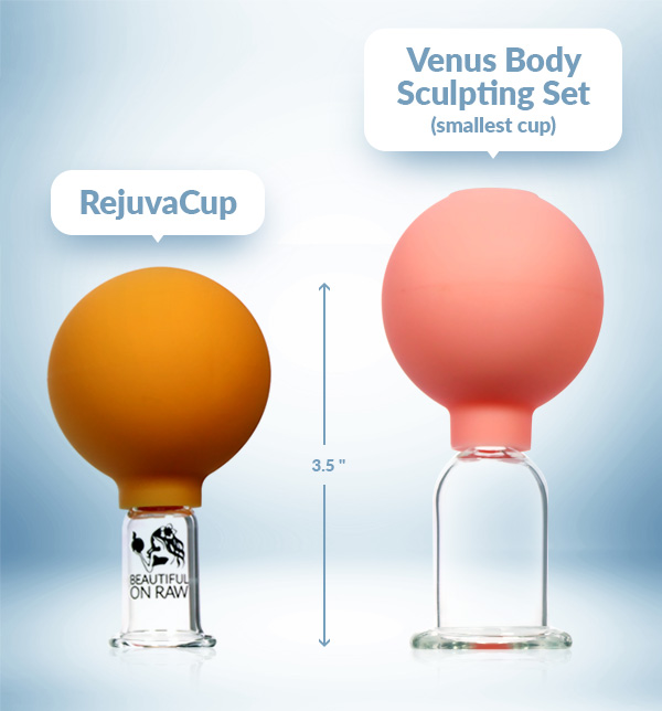 Likewise, if your face is new to cupping, you’ll want to start gently with a cup that’s made for your face: RejuvaCup. Let your facial skin adjust to this kind of massage. Then, in six to eight weeks, try the smallest cup in the Venus Set, or our new RejuvaCup HD.