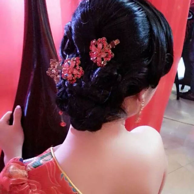 Charlene has beautiful black hair. On the left, you can see a shot of her hair arrangement on her wedding day. When she stayed with us, I was pleasantly surprised to find that she takes hair-combing seriously and is practicing the old “hundred strokes” adage!