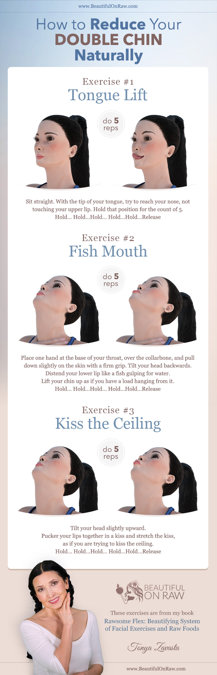 Double chins come in two flavors. One is caused by fatty deposits which result from being overweight. These can be eliminated only by improving your diet and thereby losing excess fat. Raw foods can help.