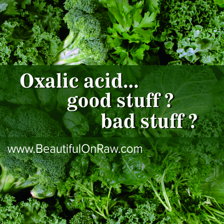 Based on my 20 years of experience of following the 100% raw food lifestyle, I believe that oxalic acid stones and calcium blockage do not occur when greens are eaten raw in moderation. Even more so, oxalic acid in its raw form is one of the important minerals to keep your colon healthy, to maintain its tone and peristalsis.