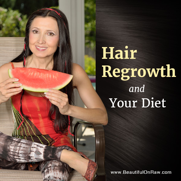 For overall hair health, include in your diet: sulfur foods (onions, radishes, hemp seeds, aloe vera)… silicon foods (cucumbers, red peppers, and other shiny-skinned produce)…vitamin A foods (carrots, arugula, papaya)…zinc foods (coconut, nuts and seeds)…vitamin C (citrus fruits)…vitamin E (avocado and olives)…and so on. In short, all raw foods! In general terms, consider that just about every raw plant food offers something good for your body and your hair—even though, for some particular foods, science has yet to map those benefits.