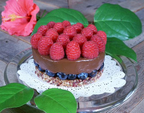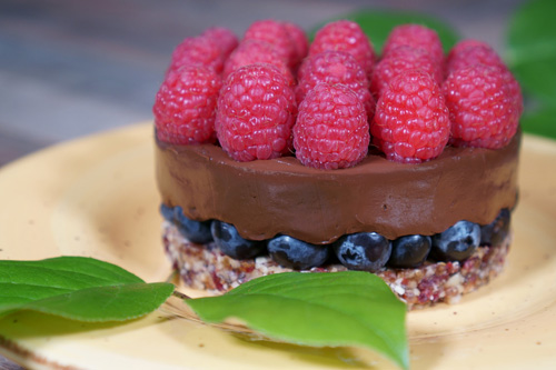 Now. The cake ingredients…The bottom layer will be your blueberries. Spread these evenly around the crust. Blend the avocado, cacao, and honey in the food processor until smooth. Using a pastry bag and a spoon, spread the chocolate-avocado mixture as the next layer above the blueberries.