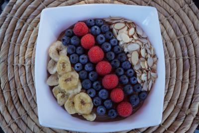 In a food processor, mix all of the ingredients until smooth. Top with your favorite berries and you’re done. Fast, healthy, and delicious!