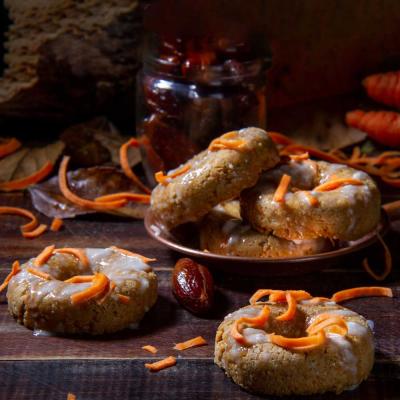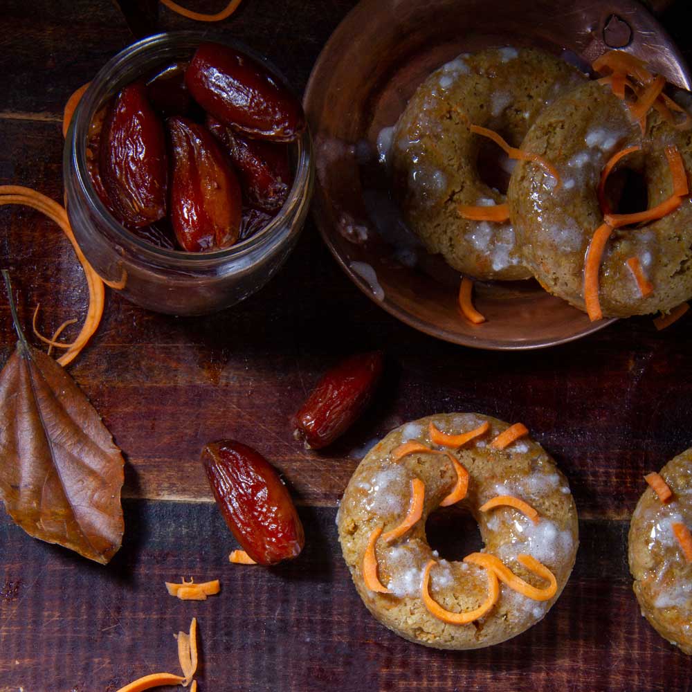 Using the spiralizer, make some thin ribbons with carrots to decorate the donuts. Mix coconut oil with raw honey. Serve the donuts decorated with coconut oil and carrot bits.