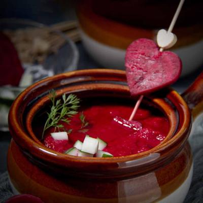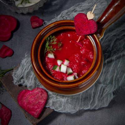 Gazpacho is a traditional cold soup of Spanish cuisine, typically made with ingredients such as cucumbers, tomatoes, peppers, and onions. Recently, a variation of the recipe has gained popularity, in which some of the tomatoes are replaced with beets, resulting in a vibrant purple dish that is perfect for special occasions like Valentine's Day.