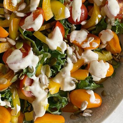Soak the cashews overnight, then the next day blend all the ingredients in a blender until smooth. Also soak the seeds for 3-4 hours. Chop the kale, cut the tomatoes and peppers. Put the vegetables in a salad bowl, sprinkle with the soaked seeds on top, and pour on the cashew sauce. Add salt and pepper to taste.