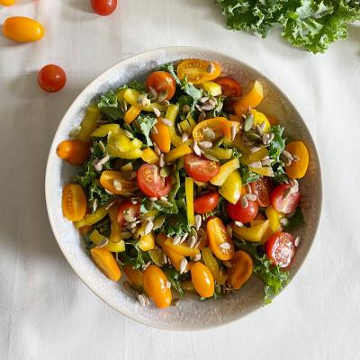 Ingredients: kale, yellow bell pepper, cherry tomatoes, pumpkin seeds, sunflower seeds, cashew