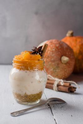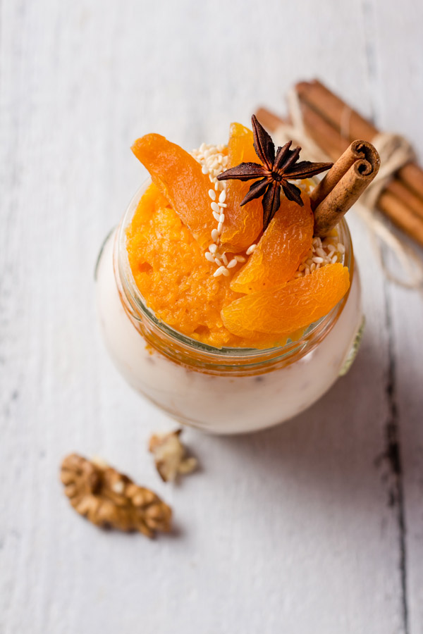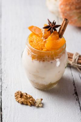 Blend the first layer’s ingredients in a food processor. Place the first layer in a glass. Мix the second layer’s ingredients and add into the glass on top of the first layer. Add the top layer of pumpkin puree and serve with dried apricots, cinnamon, anise, and cocoa powder. Enjoy!