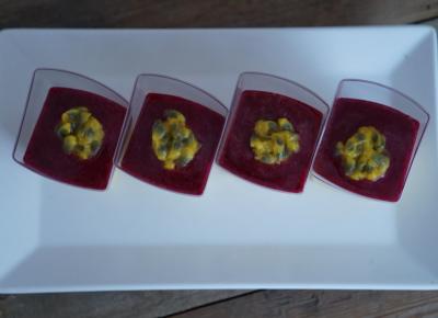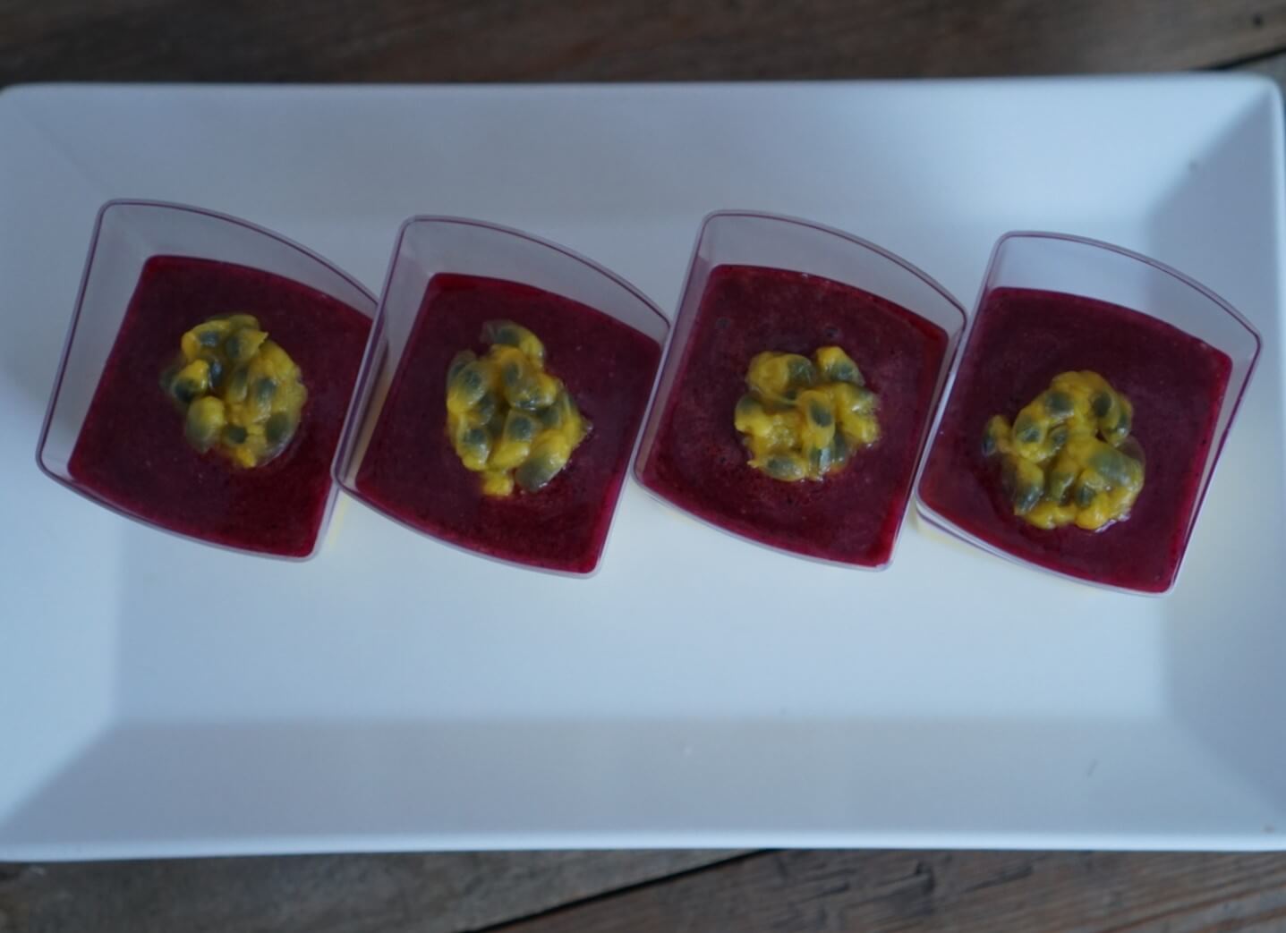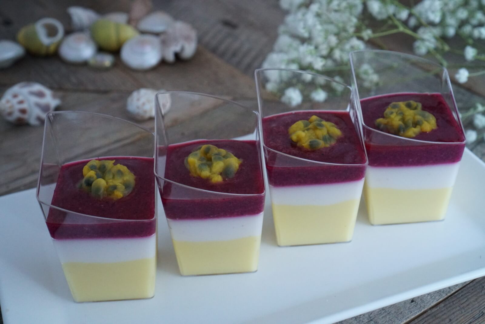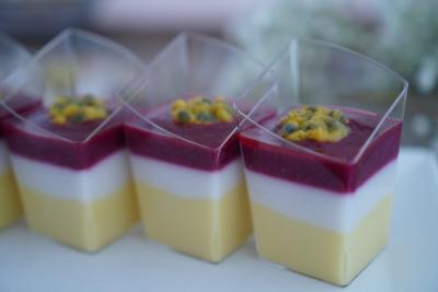 Now we can assemble our mixes into dessert shot glasses. Cut the corner of each Ziploc bag in turn. Squeeze out the first (coconut and coconut water) mixture into the bottoms of the glasses. The second mixture (coconut and passion fruit juice) will be the middle layer. The third (dragon fruit) mixture will serve as our top layer. Seeds from the passion fruit are edible and can go on top for extra flavor and crunch. Enjoy!