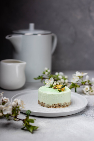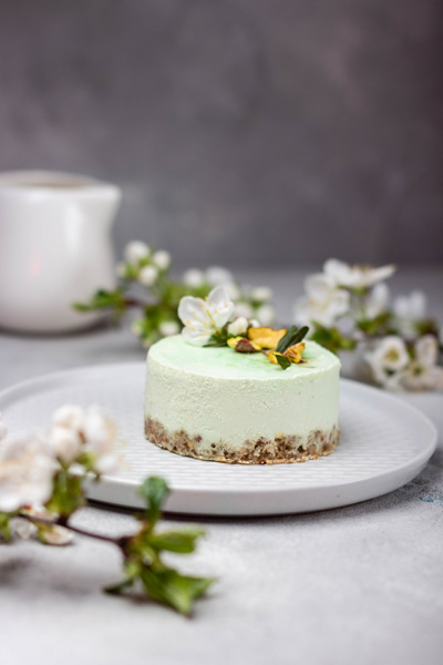 Talk up these details of matcha tea to your guests as you serve them this delicious raw cake at a holiday gathering—say, Mother’s Day. They’ll feel great after a piece of this cake and next time will ask for more!