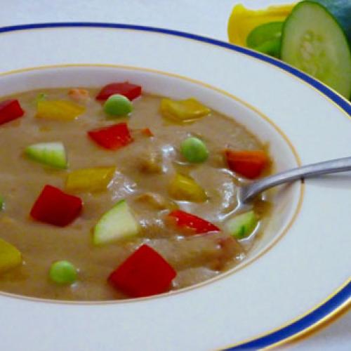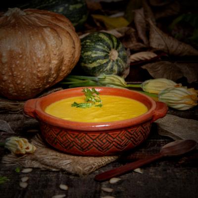 Soak cashews overnight. Cut the pumpkin in two. With a spoon, scoop out the filling and seeds. Peel the pumpkin. Then cut it into small cubes about an inch on a side. Combine the cashew nuts, coconut milk, tangerine juice, nutritional yeast, ginger, and turmeric in the blender. Blend for two to three minutes. Then add, little by little, the chopped pumpkin pieces. Blend until you get a velvety-smooth texture. Serve the soup in shallow bowls. Garnish with pumpkin seeds or a little chopped cilantro.