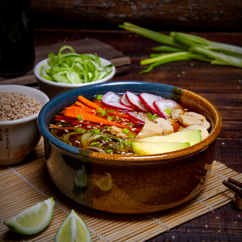 Ramen traditionally is wheat noodles served in a warm meat broth. Practically none of the ingredients are on my diet. Let us take a traditional recipe and create something with the spirit of the original recipe but filled with raw healthiness, wholeness, and goodness. “Raw equals cold.” That’s what so many raw food recipes imply. But here’s a scrumptious recipe with an Asian charm and a welcome warmth.