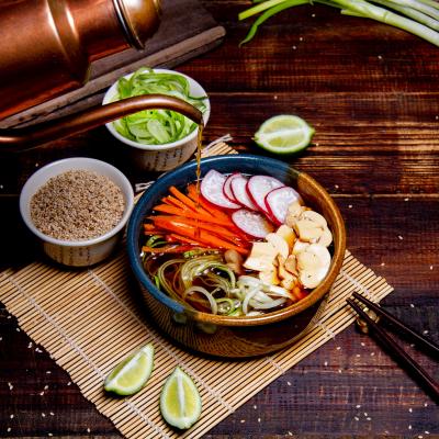 For the broth, combine, in a mixing cup, two cups of warm water with the coconut aminos, grated ginger, crushed garlic, and salt to taste. If you like, add a little tamarind paste. Stir very well. Fill the bowls with the warm broth you’ve just made.