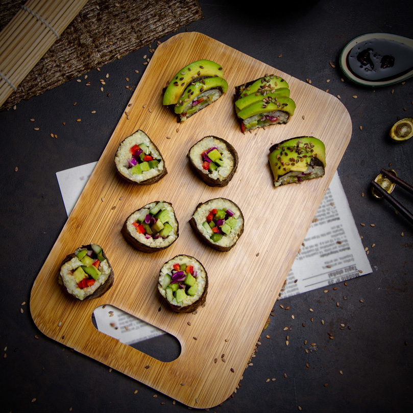 We’ve a lot to learn from Japanese cuisine and its many iconic raw dishes. Here, we’ll make traditional Maki, rice rolls wrapped in Nori seaweed. We’ll substitute raw cauliflower rice for cooked rice. Try to make your makis colorful and attractive.