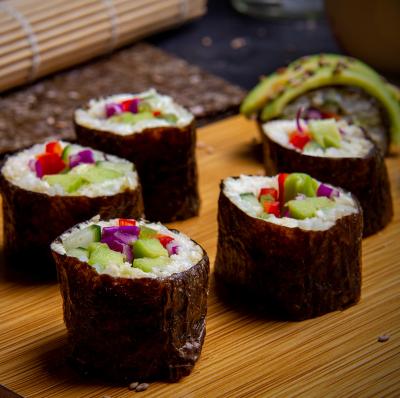 Arrange the vegetables lengthwise on top of the rice. Carefully roll up the seaweed, using the mat to help you to press the ingredients. Repeat the operation with the rest of the ingredients. Use a wet knife to cut the sushi into appropriate portions. You can decorate some makis with thin slices of avocado, or sprinkle on some sesame seeds.