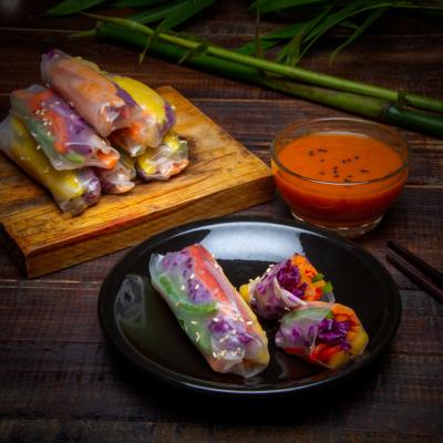 In the center of the rice paper, lay the vegetable strips next to one another. First the carrot, then the mango, the green bell pepper, the red bell pepper, the purple cabbage, and chopped wild peanuts. Add a teaspoon of sauce. Close the rolls. Fold the sides over the filling, making two folds. Then roll up on the opposite side and close. Serve the rolls with sauce.