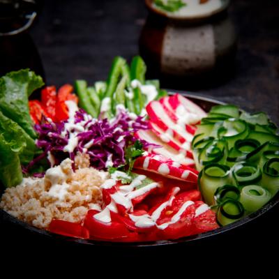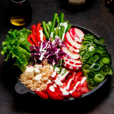 Cut the tomatoes into thin slices or whole wheels. Set these next to the bulgur. Cut thin slices of cucumber. Roll them into flowers as in the photo and set these next to the tomatoes. Add radish wheels. Cut the peppers into thin strips and arrange these next to the radishes, cut strips of cabbage alongside as well. Cut the lettuce with kitchen scissors and use it to fill the empty spaces in your bowl.