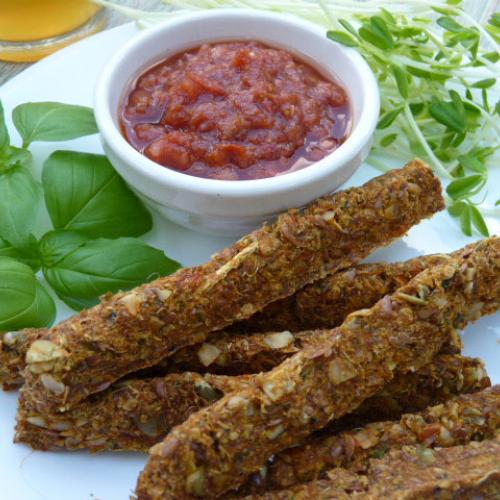 Ingredients: zucchini, flax seeds, pumpkin seeds, celery, carrot, garlic, sundried tomato, tomato, green onion, lemon
