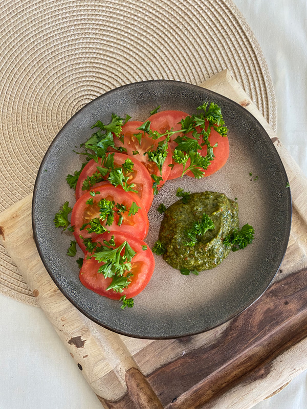 Wash the greens and peppers. Put all the ingredients in a food processor and pulse. Chop the tomatoes and add the sauce on top. You can serve this sauce with any vegetables.