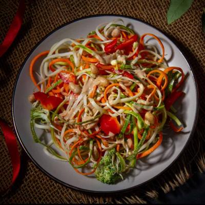 This recipe is ideal for a romantic dinner, where you’d want to share delicious dishes while eating healthy. We substitute coconut for soy, and noodles made from zucchini, carrots, and sprouts for the usual rice noodles. Try this one on Valentine’s Day!