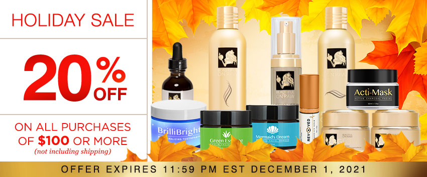 This holiday season we’re offering you our highest discount, the level we reserve for the holidays only, just once a year, on all orders of $100 or more, placed between now and December 1, 2021. That’s a full 20% off. Spend $100 or more in our Online Beauty Store by Wednesday night, 11:59 p.m. EST, December 1, 2021, and get 20% OFF.