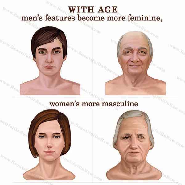 Men’s features become more feminine, women’s more masculine, and we lose our “girlishness.” In women, menopause exacerbates the situation. It all gets more dramatic as we move into our 60s and 70s.